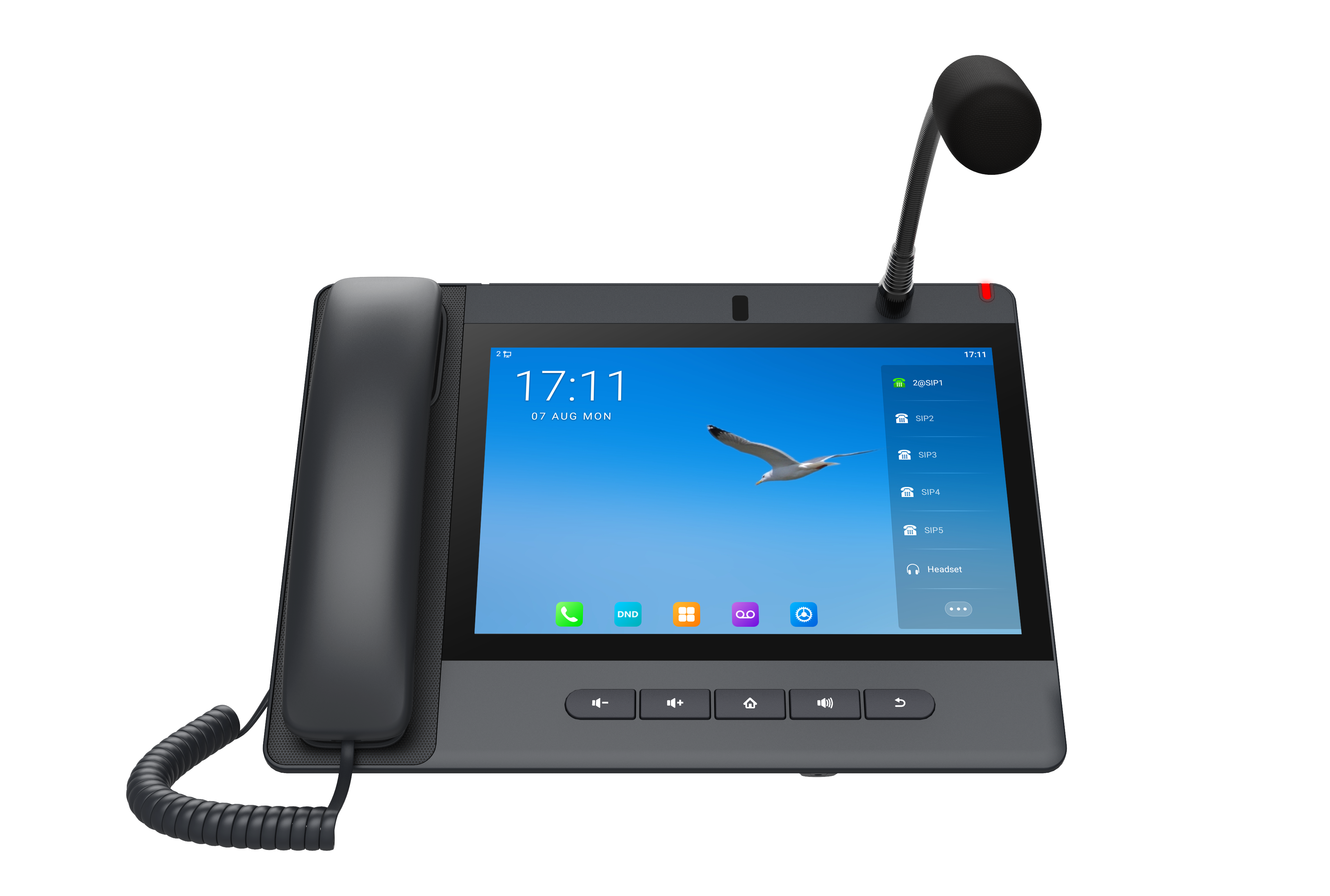 SIP-телефон A320i на ОС Android 9.0 со встроенной камерой функционирует не только как IP-телефон, но и как консоль мониторинга и оповещения. Обладает микрофоном "гусиная шея" и поддерживает HD-громкую связь, звонки на внешние и внутренние номера, двустороннюю связь с домофонами, режимы мониторинга и оповещения, улучшая эффективность управления и аварийного реагирования.